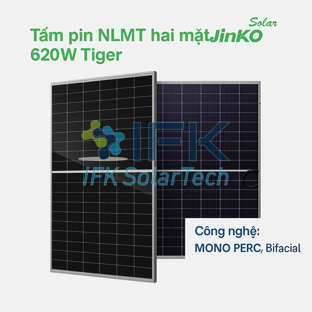 Jinko Solar 620Wp – Tiger Neo ứng dụng công nghệ N-Type TOPCon và thiết kế hai mặt kính (bifacial), mang lại hiệu suất vượt trội, độ bền lâu dài và sản lượng điện ổn định cho cả dự án hộ gia đình và quy mô thương mại.